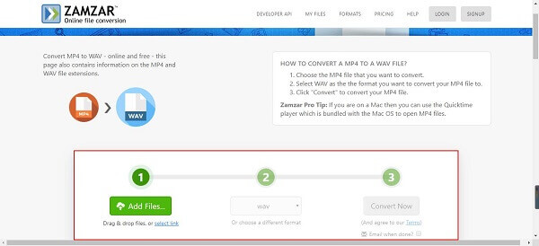 ZAMZARはオンラインでMP4からWAVへの変換を実現させる変換ソフトです。操作方法は下図の示す通りで、変換したいMP4ファイルを追加したら、簡単に変換できます。変換完了後、そのページで変換したWAVオーディオファイルをPCにダウンロードすれば結構です。