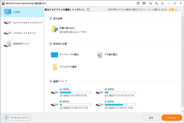 MiniTool® Power Data Recoveryはデスクトップ、ごみ箱、フォルダーごとでデータを復元し、破損した・フォーマットされたドライブ、カメラ/携帯電話のメモリカードなどから削除、紛失したファイルを復元できるソフトウェアです。ハードディスクの故障、ウイルス感染、OSクラッシュ、パーティション紛失、物理障害、RAWパーティションなどいろいろな思いがけない状況から消えたデータをリカバリー、救出できます。