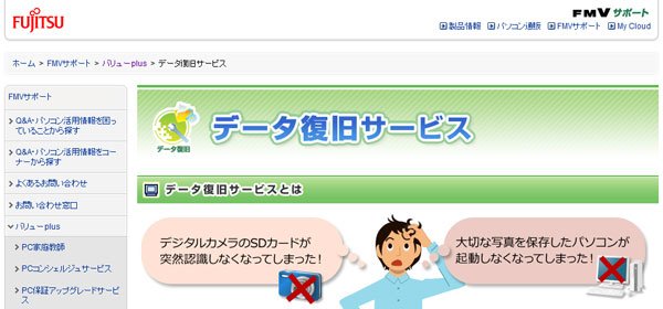 富士通データ復旧サービスはパソコンの内蔵ハードディスク、USBメモリー、コンパクトフラッシュ、SDカード/miniSDカード/microSDカード、xDピクチャカードなどの記憶装置からデータを救出してくれるデータレスキューサービスです。