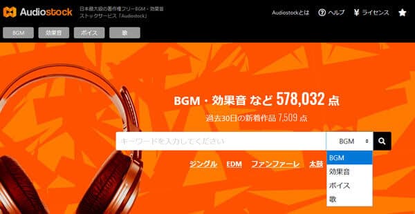 Audiostockは日本最大級の著作権フリーBGM・効果音ストックサービスだと誇り、57万点を超える作品(BGM/効果音/ボイス/歌もの曲)を販売するサービスです。毎月4,000点を超える新作が追加されていて、映像、ゲーム、アプリ、イベント等の商用シーンで利用できます。音楽素材の購入について、1点ごとご購入いただく「単品購入」と、月額支払いで使い放題となる「定額制プラン」があります。