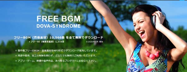 DOVA-SYNDROMEはフリーBGM(音楽素材)10565曲を全て無料でダウンロードできる著作権フリー音楽サイトです。このサイトでは、著作権フリーのBGM・音楽素材をMP3形式でダウンロード配布し、用途や商用、加工の有無を問わず、無料で利用できます。また、BGM、SEをアプリやゲーム、映像、音声作品などあらゆるプロダクトに利用できま。ただし、リンク設置やコピーライト表記、紹介は必須ではなく、著作権・提供等の表示は不要ですが、音源の権利は当該音源の作曲・制作者が保持しています。