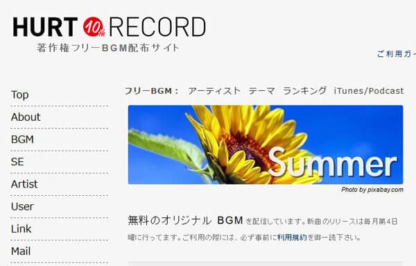 HURT RECORDは百名以上のサウンドクリエイターが活躍中、1600曲以上のBGM、470曲のフリー効果音を商用・非商用にかからわずに、無料提供してくれる著作権フリーBGM配布サイトです。ただし、商用利用の場合はメールで連絡する必要があります。