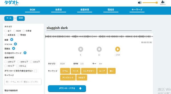 タダオトにアクセスして、楽曲を検索して、「ダウンロードする」ボタンをクリックするだけで音楽素材をダウンロードできて、利用方法は簡単です。