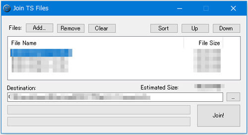 TSファイルを結合するには、TSSplitterメイン画面の「File」>「Open for Joining...」を選択して、「Join TS Files」画面を開き、結合させたいTSファイルを追加して、「Up」または「Down」ボタンでその再生位置を調整してから、右下の「Join!」をクリックすることでTSビデオファイルをつなげて、結合できますので、TSSplitterの使い方がシンプルです。
