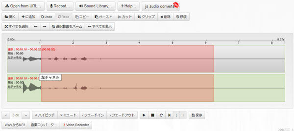 Bearオーディオエディターは無料のオンラインMP3カッターサイトで、MP3の他に、WAV、OGGの編集にも対応していて、特別なアプリやソフトをインストールすることなく、ブラウザ上でMP3ファイルを切り取り、結合、分割できます。また、MP3、WAV、OGGオーディオのフェードインとフェードアウトを設定し、ボリュームのシュートと調整も可能です。特に、HTML5ベースなので、編集したいMP3オーディオファイルをサーバーにアップロードする必要がないのは安心させられます。