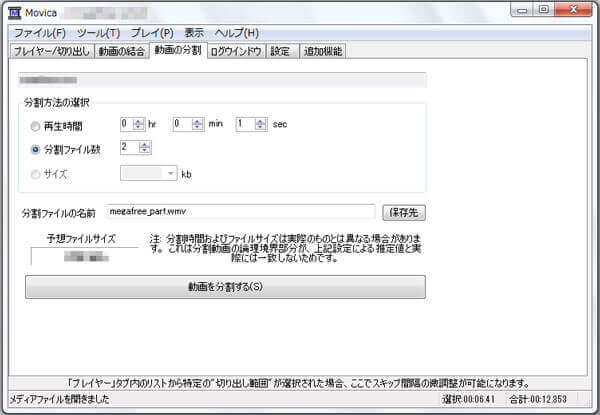 具体的に、メニューバーにある「ファイル」>「メディアファイルを開く」から、分割したいMP4ファイルを読み込んでから、「動画の分割」タブをクリックして、分割ファイル数または再生時間、ファイルサイズを指定してMP4ファイルを無料分割できます。