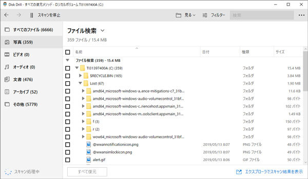 Disk DrillはWindowsの内蔵ハードディスク、外付けハードディスク、USBメモリー、SDカードなどの記録媒体からファイル、フォルダを復元できるデータ復元ソフトウェアです。クイックスキャンとディープスキャンを用意しているため、すべての消えたデータを徹底的にスキャンして見つけられます。それに、検索一覧から検出したファイルをプレビューでき、必要なファイルのみを復元できます。