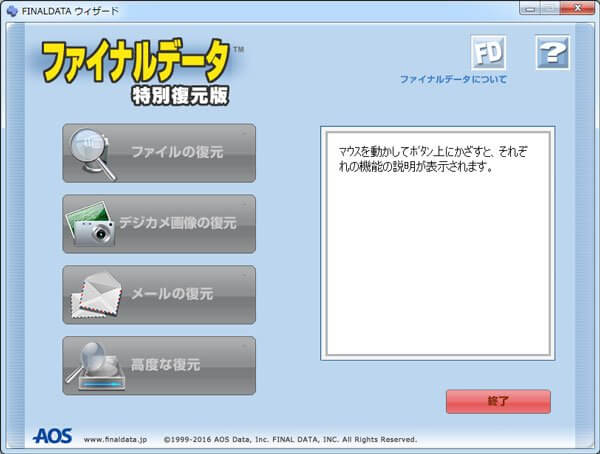 ファイナルデータはHDDのドライブ、パーティション、USBメモリー、SDカードのファイル、フォルダ復元に対応した復元ソフトウェアです。この復元ソフトの画面に表示される「ファイルの復元」、「メールの復元」、「デジカメ画像の復元」、「高度な復元」から復元したい内容を選んで、クリックするだけでスキャンが始まり、HDDなどから消えたデータ、壊れたデータの復元ができます。特に、最新の仕様の外付けハードディスク、内蔵ハードディスクのデータを復元し、ハードディスクドライブが正常に認識できない場合、パーティションを誤って削除してしまった場合に見えなくなったファイルを復元できます。